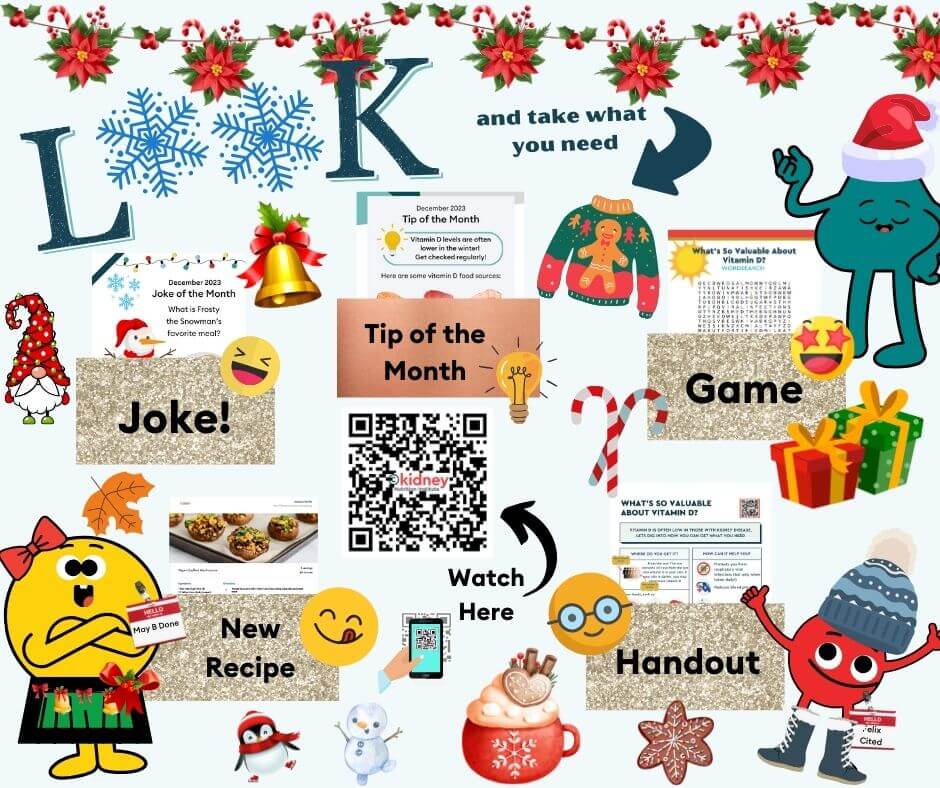 Interactive Bulletin Board: A holiday-themed display featuring a nutrition-related joke, a seasonal recipe, tip, game