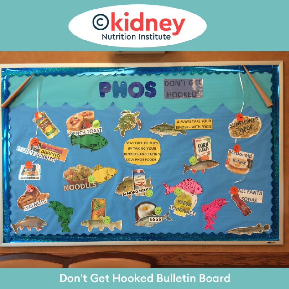 Description: This bulletin board helps patients identify hidden phos in fish and seafood. A great way to help patients vary their protein intake as well