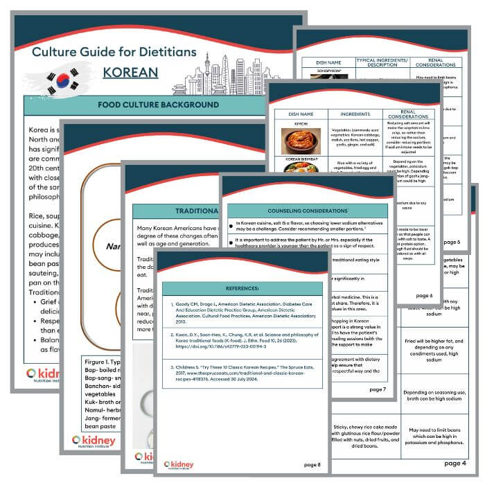 Description: The RD guide helps the dietitian go beyond the basics of having handouts in Korean. It helps the dietitian better understand the culture, relevant holidays, and important traditions to better counsel and support the patient in making kidney-friendly choices