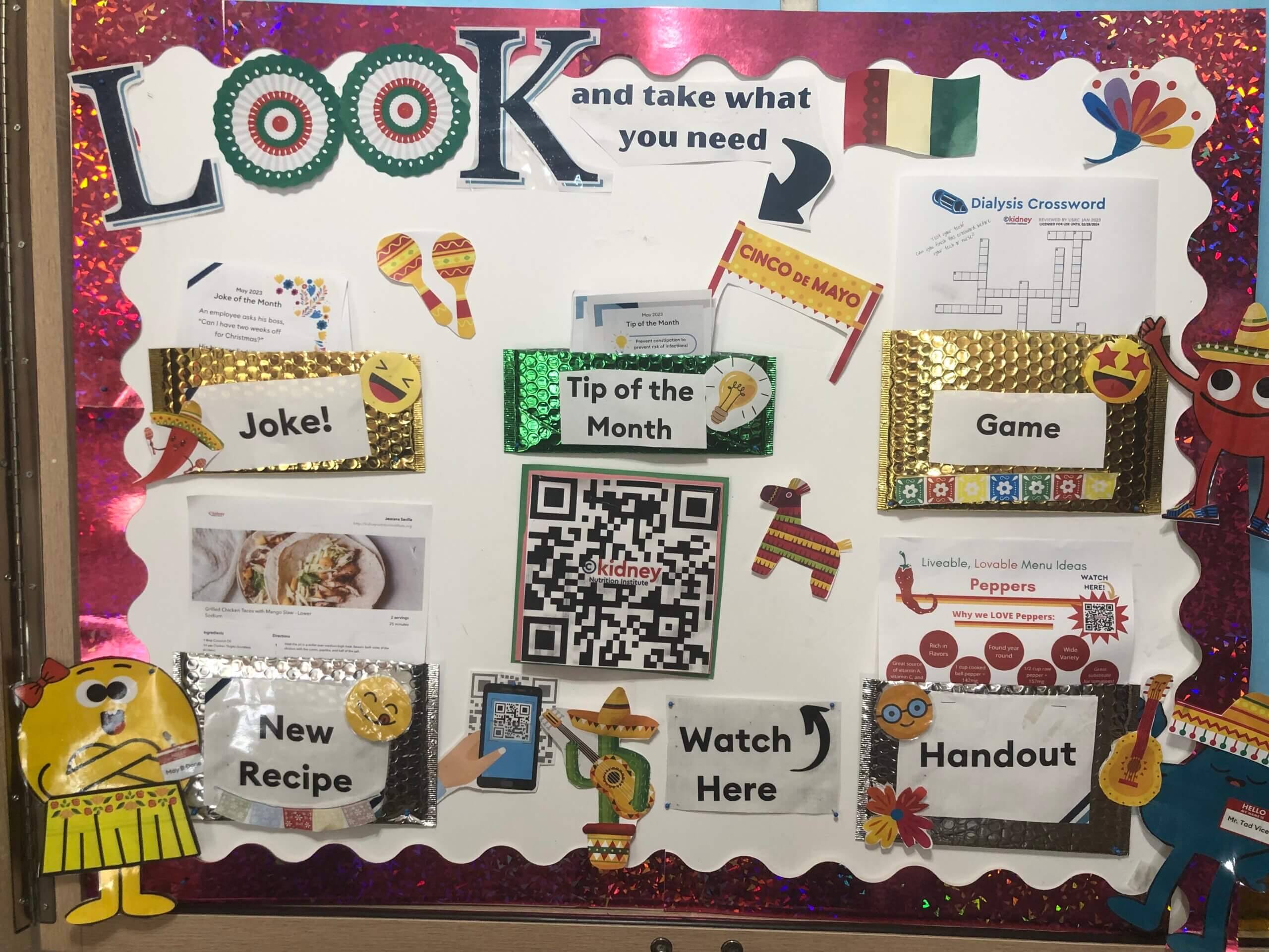 – *Cinco de Mayo-Themed Bulletin Board*: Features a kidney-friendly recipe, a nutrition-related joke, a “Maintain Your Membrane” crossword to reinforce the handout content, a kidney health tip, and a QR code linking to an educational video.