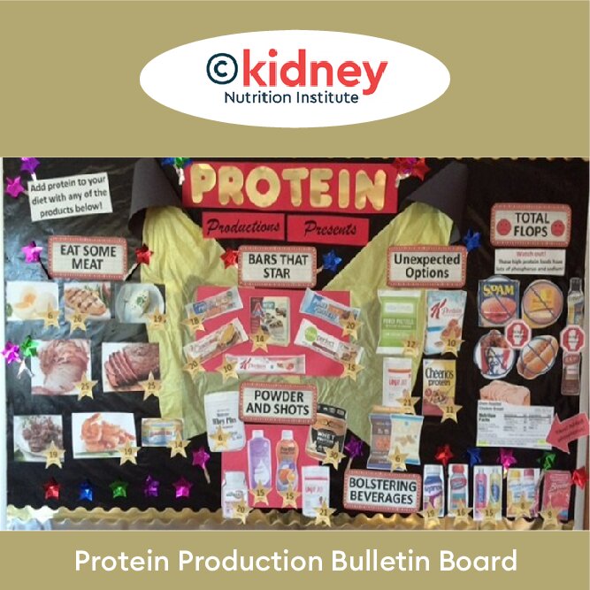 Description: This bulletin board uses a movie theme to show patients the best kidney-friendly protein options and pairs well with the “protein celebrities” or kidney-friendly protein handout.