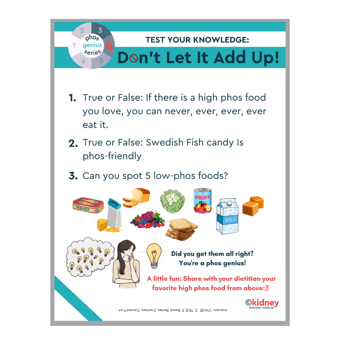 Description: Part of our phos genius series, use this phos learning assessment or quiz to better assess your patients retention of phosphorus information. This goes with the “Don’t let it add up” phosphorus skill #4 handout. There are multiple ways to use this: lobby days, health fairs, or contests with prizes, as part of a QAI initiative, and a way to change up your counseling techniques.
